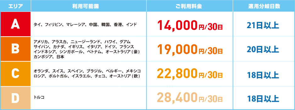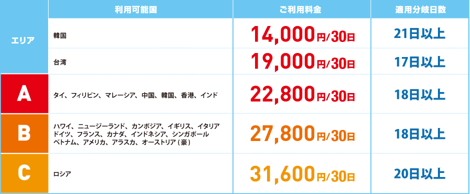 下記、利用可能国に関してはお得な30日パックプランをご利用いただけます。※WiFiプランに限ります。