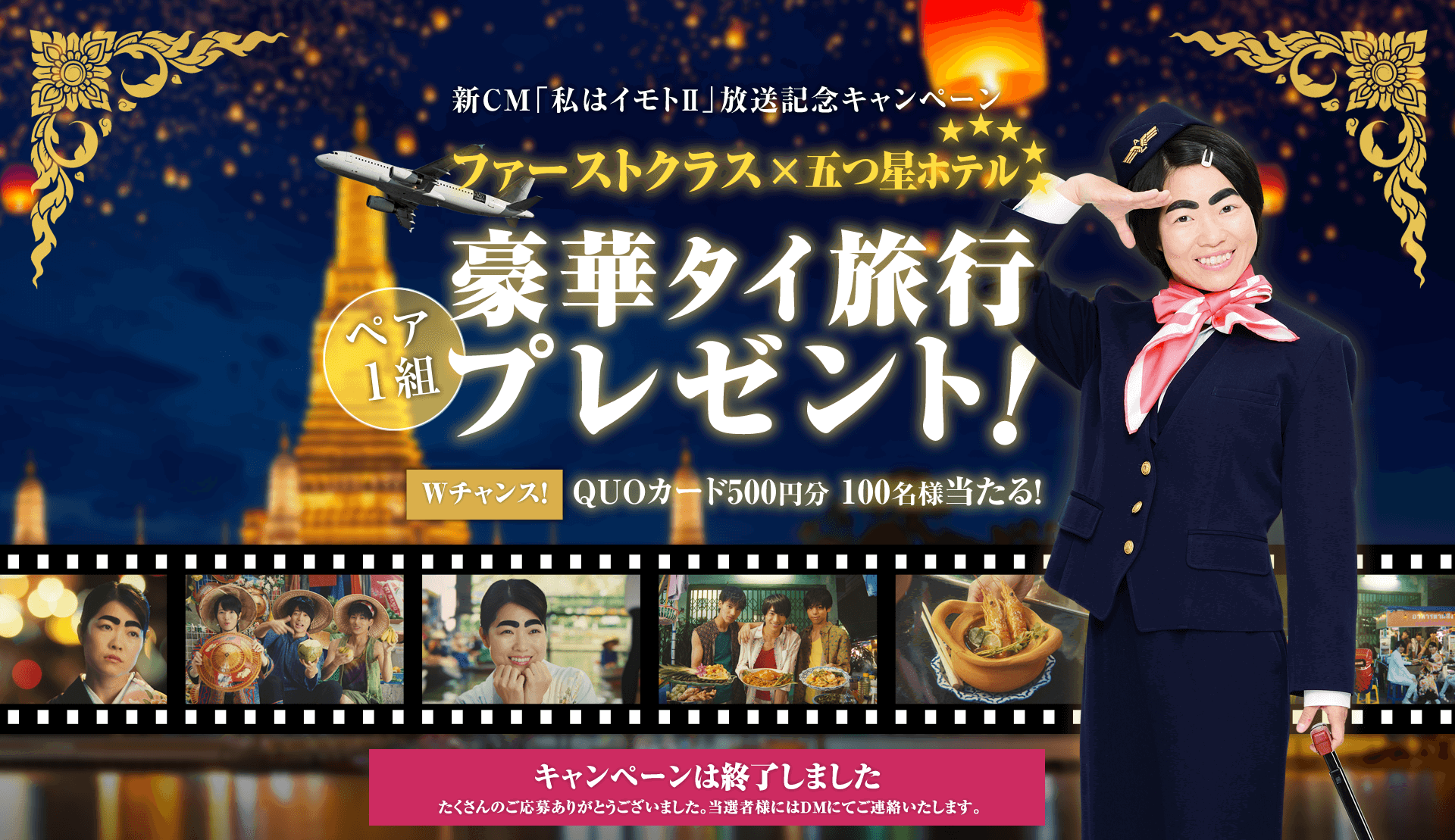 イモトのWiFi公式アカウントをフォロー&新CMツイートをリツイートした方の中から抽選で、夢のファーストクラス&五つ星ホテルの豪華タイ旅行や、オリジナルQUOカードを合計101名様にプレゼントします!