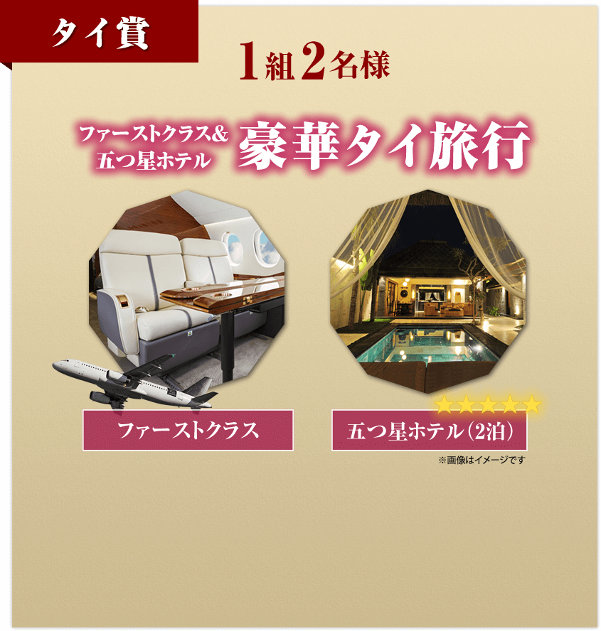 なお、タイ旅行ペアチケットにつきましては、下記の「賞品について」をご確認下さい。■応募方法