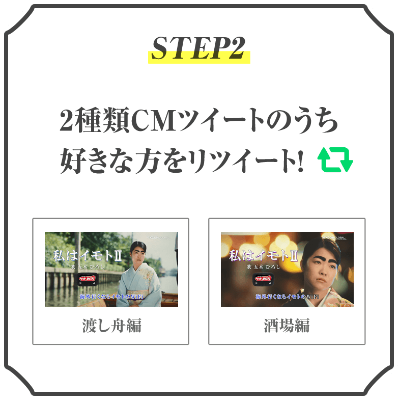 STEP 2:イモトのWiFi公式Twitterアカウントがツイートする対象のキャンペーン投稿を、コメント付きでリツイートすると応募が完了します。