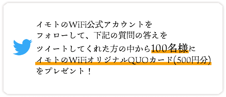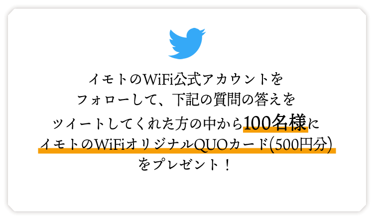 - イモトのWiFiの公式Twitterアカウントをフォローし、イモトのWiFiがツイートする指定のつぶやきに記載しているハッシュタグをつけてツイートしてくれた方の中から、抽選で100名様に「イモトのWiFiオリジナルクオカード(500円分)」をプレゼントいたします。