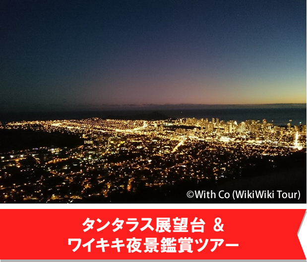 ワイキキの海とホテル群を見下ろすタンタラスの丘からゴールドに輝く星空のような夜景を見渡せるツアープランです。