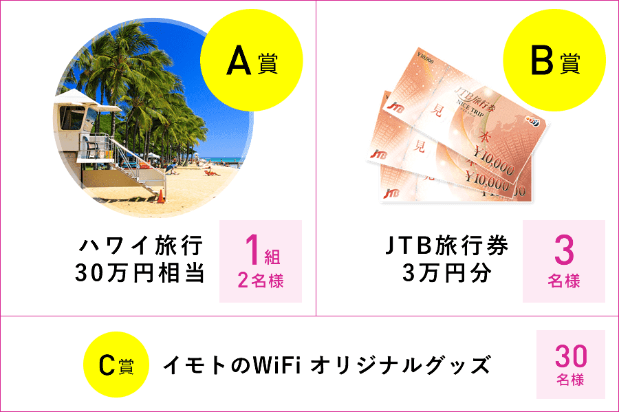 賞品:ハワイ旅行 3泊5日 ペア1組/JTB旅行券3万円分 3名様/イモトグッズ 30名様