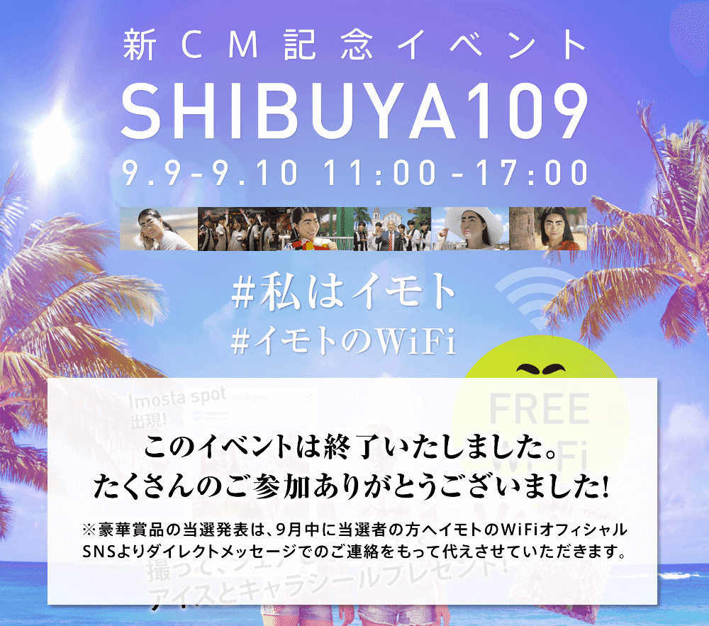 渋谷109前イベントスペースにて、9月9日(土)・10日(日)の二日間限定で新CM「私はイモト」の記念イベントが開催されます。ハワイアンなフォト&FREE Wi-Fiスポット「Imosta spot」が出現!